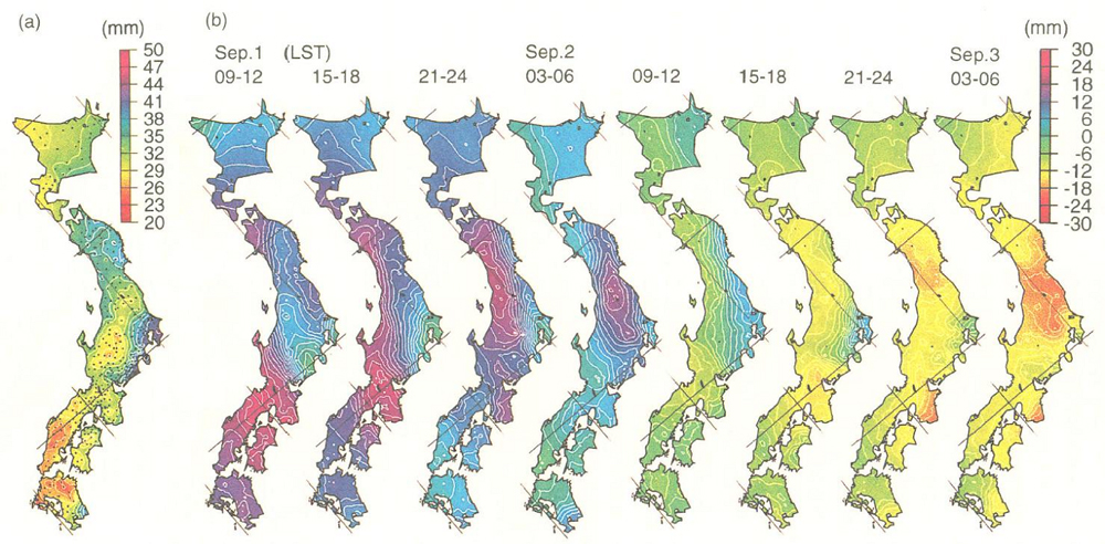 このような計測手法での関わりばかりでなく, 大気と固体地球は物理現象としてもさまざまな興味深い関係を持っている. 例えば, 大気と固体地球の角運動量の交換が地球の自転速度を変化させることは, すでに20年以上前から知られていたし, また, 最近発見された常時地球自由振動の原因としても大気が有力視されている. 測地学の対象は, 固体地球ばかりでなく, 大気, あるいは海洋を含めた1つのシステムとしての地球なのである.