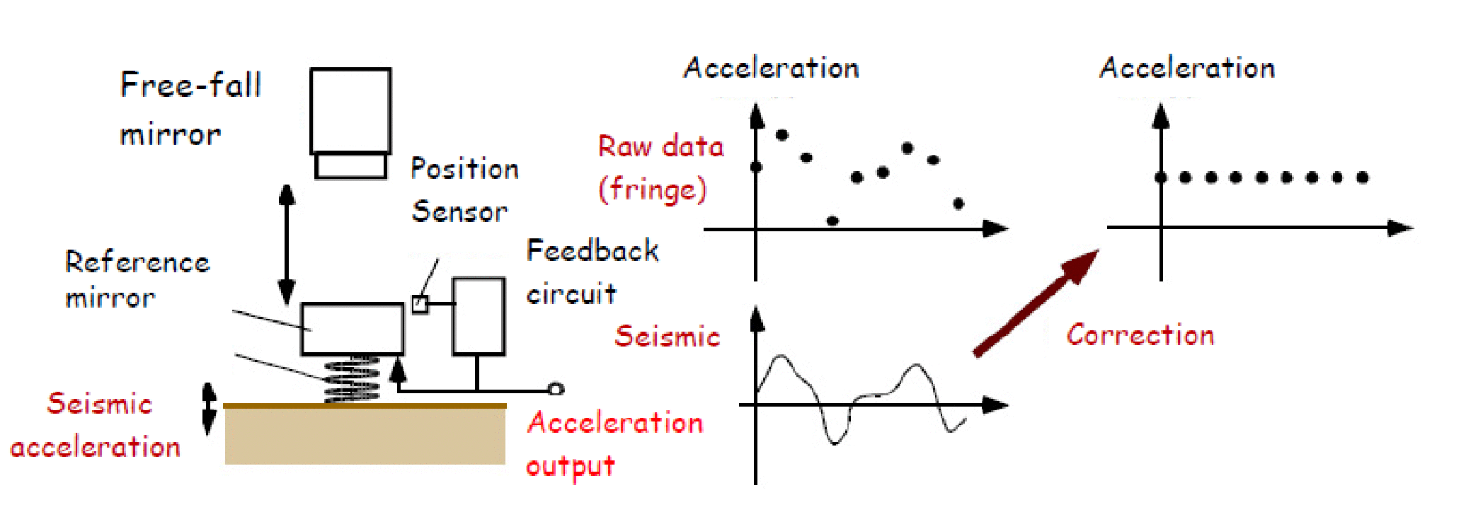 TAG-1では, 5分に1回の頻度で落体を落とし重力値を測定する. 干渉計は図3左, 同右下のように落体の変位に対してSin, Cosに対応する2位相の干渉縞を生成するように半波長板 (HWP) や1/4波長板 (QWP) が組み込まれており, 各信号によるリサージュ (図3右上) の位相角から落体の変位が求められる. 自由落下する落体の変位は時間に対して2次関数で変化するため, 計測された変位を2次関数でフィッティングした2次の係数から重力値が求められる. ただし, これには参照鏡の地面振動加速度が含まれているため, 参照鏡が組み込まれている除振装置からの地面振動信号を利用して補正し, 本来の重力加速度が求められる (図4) . 図5はTAG-1を用いて地震研究所霧島観測所 (宮崎県えびの市) で観測されたデータである. 干渉縞から求められた重力値を地面振動データ (seismic acceleration) で補正した結果が重力データ (gravity) である. 潮汐の理論値 (theoretical tides) とほぼ同じ重力変動が観測されていることがわかる.