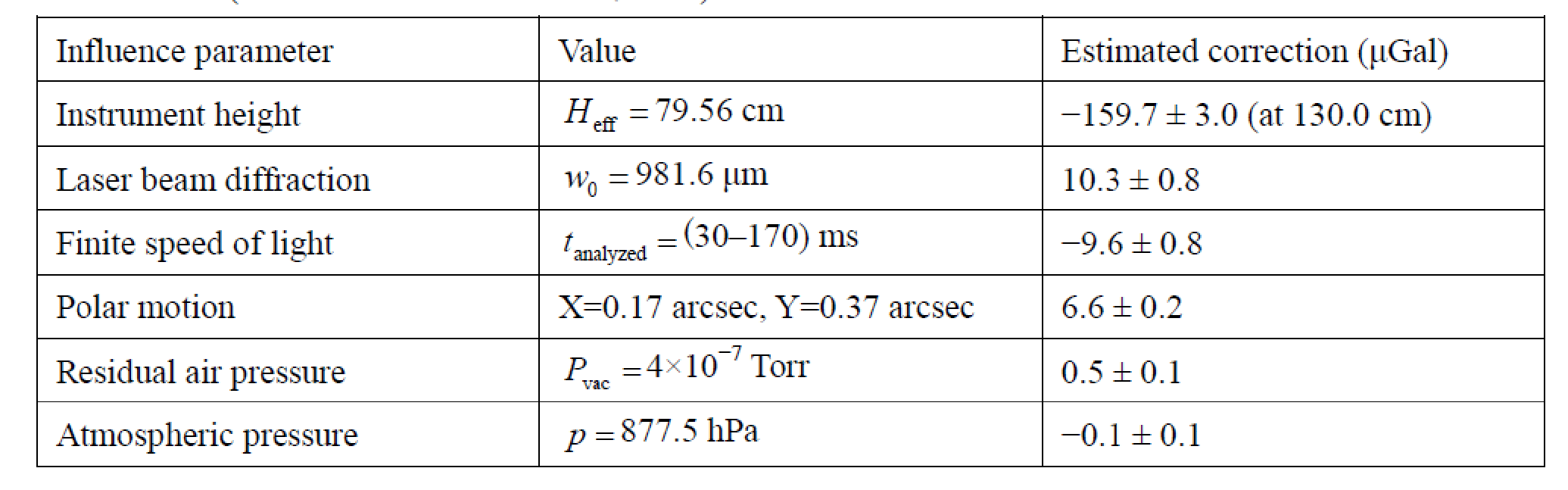 干渉計で用いられるレーザー光はほぼ平行ビームとなるように調整される. しかし, ビーム径が細いと回折のため球面的な波面になり, その位相が平面波の場合からわずかにずれ, 干渉計測の系統誤差が生じる. 1μGal以下の誤差にするためには, ヘリウム・ネオンレーザーの場合はビーム径はおおよそ5mm以上にする必要がある. TAG-1ではビーム径を測定し, 計算で補正している. 落体は移動しながらレーザー光を反射するため, 落下開始時と着地時で反射位置が異なりその間の光の伝播時間を考慮して落体の運動を求める必要がある. しかし, 計算が煩雑なため光の伝播時間の効果はそれを考慮しない計算からの補正量として通常扱う. 落体の落下時間や反射する方向 (前進か後退か) で補正量と符合が異なり, TAG-1の場合約10μGalのマイナスの補正量である. 真空容器内の残留ガスによる影響も系統誤差となる. TAG-1では実験的に求められた係数1.2Gal/Torrと観測中の真空度から補正を行っている. 干渉縞の計測で使用される光検出器や記録装置の周波数特性も誤差要因になる. ヘリウム・ネオンレーザーの波長で10cm程度の落下の場合, 干渉信号の周波数は0~4.4MHz程度まで変化する. その間の検出系の周波数特性による位相変化は系統誤差になる. それを避けるために, 干渉信号の最大周波数よりも十分速い検出系を用いることが望ましい. 大気による重力効果は, 観測地点の標高によって決まる標準的な大気圧と観測時の気圧から補正係数 (-0.3μGal/hPa) を乗じて計算し適用する. 極運動の補正は, 地球の自転軸のゆらぎにともなう遠心力の変動の補正で, IERS (International Earth Rotation and Reference Systems Service, 国際地球回転・基準系事業) で公表されている極運動座標から補正量を計算する. 数μGalの補正量である.