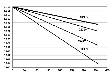 図3. 衛星高度による重力ポテンシャルの減衰. 横軸に球面調和関数の次数, 縦軸に地表での重力ポテンシャルに対する相対的な信号の強さを示す. 図中の数値は衛星の高度.