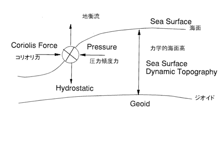海面高度計とは, マイクロ波レーダーを用い, 衛星軌道から海面までの距離を測定するもので, 衛星の軌道が正確に判っているとすると, 地球楕円体から海面までの距離, すなわち海面高が測定される(WEB版測地学テキスト2-4-1-5. 図13参照). もし, 海面が理想的に静止しているとすると, それは一つの等重力ポテンシャル面となるはずで, これがジオイドである. しかし, 実際の海面は様々な原因で常に変動しており, 特に海流が存在する場合には, 図4に示すように, 海流(地衡流)によるコリオリ力と海面の傾斜による圧力傾度力が釣り合うように海面に起伏が生じる. このようなジオイドに対する海面の起伏は力学的海面高度と呼ばれ, 逆に, 力学的海面高度が判れば, 地衡流の仮定から海流の流速や流量を知ることができる.