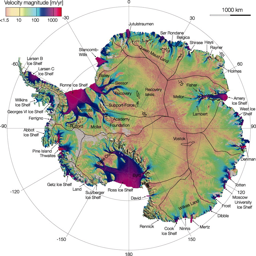 図1 ALOS/PALSAR, Envisat/ASAR, Radarsat-2, ERS-1/2のデータに基づいて得られた南極大陸の氷床/氷河の流動速度分布(Rignot, E., J. Mouginot, B. Scheuchi (2011a), Ice Flow of the Antarctic Ice Sheet, Science, 333(6048), 1427-1430, DOI: 10.1126/science.1208336). 海沿いの接地線も干渉SARの手法によって得られている(Rignot, E., J. Mouginot, and B. Scheuchl (2011b), Antarctic grounding line mapping from differential satellite radar interferometry, Geophys. Res. Lett., 38, L10504, doi:10.1029/2011GL047109.).