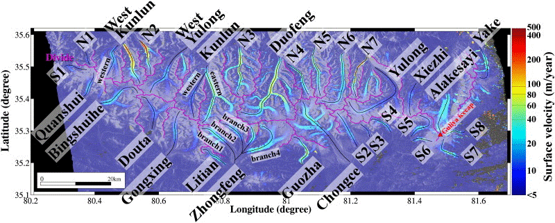 図2 ALOS/PALSARから得られた西クンルン山脈の氷河表面速度分布の一例. 表面速度の分布を対数スケールで示してある. West Kunlun氷河とN2氷河はサージが進行中である. 紫色の線は分水嶺を示し, 北側に流れる氷河と南側に流れる氷河に分けられる. 黒実線は氷河の流線を示す. (Yasuda, T., and M. Furuya (2013), Short-term glacier velocity changes at West Kunlun Shan, Northwest Tibet, detected by Synthetic Aperture Radar data, Remote. Sens. Environ., 128, 87-106, doi:10.1016/j.rse.2012.09.021)