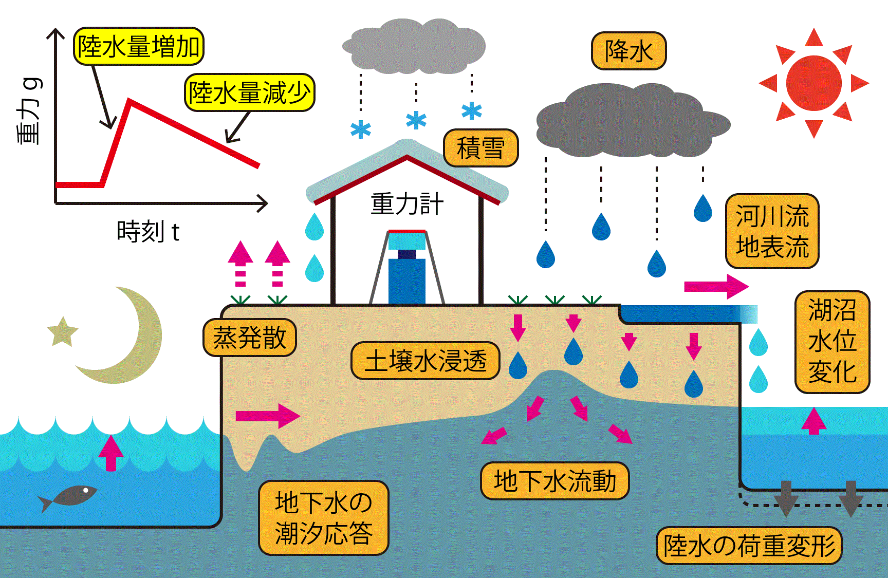しかしながら, 重力は降水・土壌水浸透・地下水流動といった陸水分布の時空間変化にも敏感であり, この陸水起源の重力変化が擾乱(陸水擾乱)となって, 上記に示した固体地球起源の重力シグナルを覆い隠すことがある. また, 陸水擾乱は重力観測点周辺における陸水質量の時空間分布を強く反映しているので, 陸水擾乱の時間的形状および振幅は観測点の位置や観測点周辺の地形によって大きく異なる(→第3節に詳述). そのため, 陸水擾乱の物理メカニズムに関する統一的な理解は, これまで十分になされてこなかった.