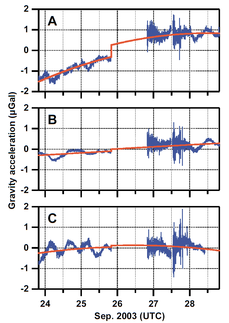 Imanishi et al. (2004)は岩手・長野・京都にそれぞれ設置された超伝導重力計を用い, 2003年十勝沖地震(Mw 8.0)に伴う重力変化を観測した. そもそも, 大地震発生時には地殻変動によって上下方向に変位が生じ, 地殻内部に密度分布変化が生じる. 十勝沖地震の際には, これらの効果によって最大0.6 μGalの重力変化が観測され, 1990年代に提唱された地震時重力変化の理論(Okubo, 1992)を証明することとなった.