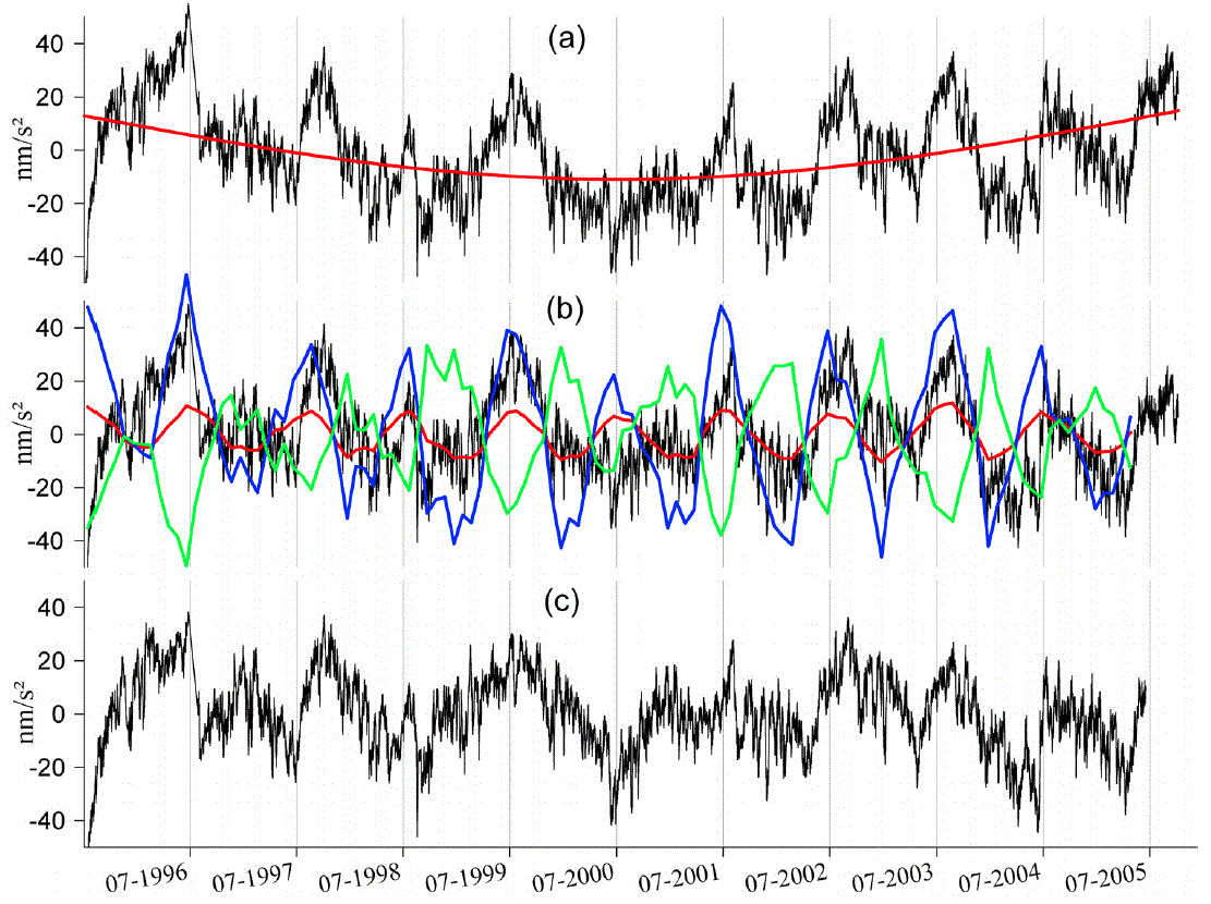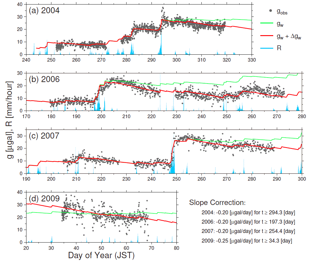 このように, 重力観測は地震・火山活動・氷床変動といった固体地球起源の変動を検出・監視することができる. しかしながら, このような重力シグナルが検出できるのは陸水擾乱の小さい時期に限られており, 例えば台風襲来期の火山噴火時には火山活動起源の重力シグナルが陸水擾乱に覆い隠されてしまう(Kazama and Okubo, 2009). したがって, 乾期・雨期に限らず固体地球起源の重力変化を把握するためには, 陸水起源の重力擾乱を適切にモデル化・補正する必要がある.