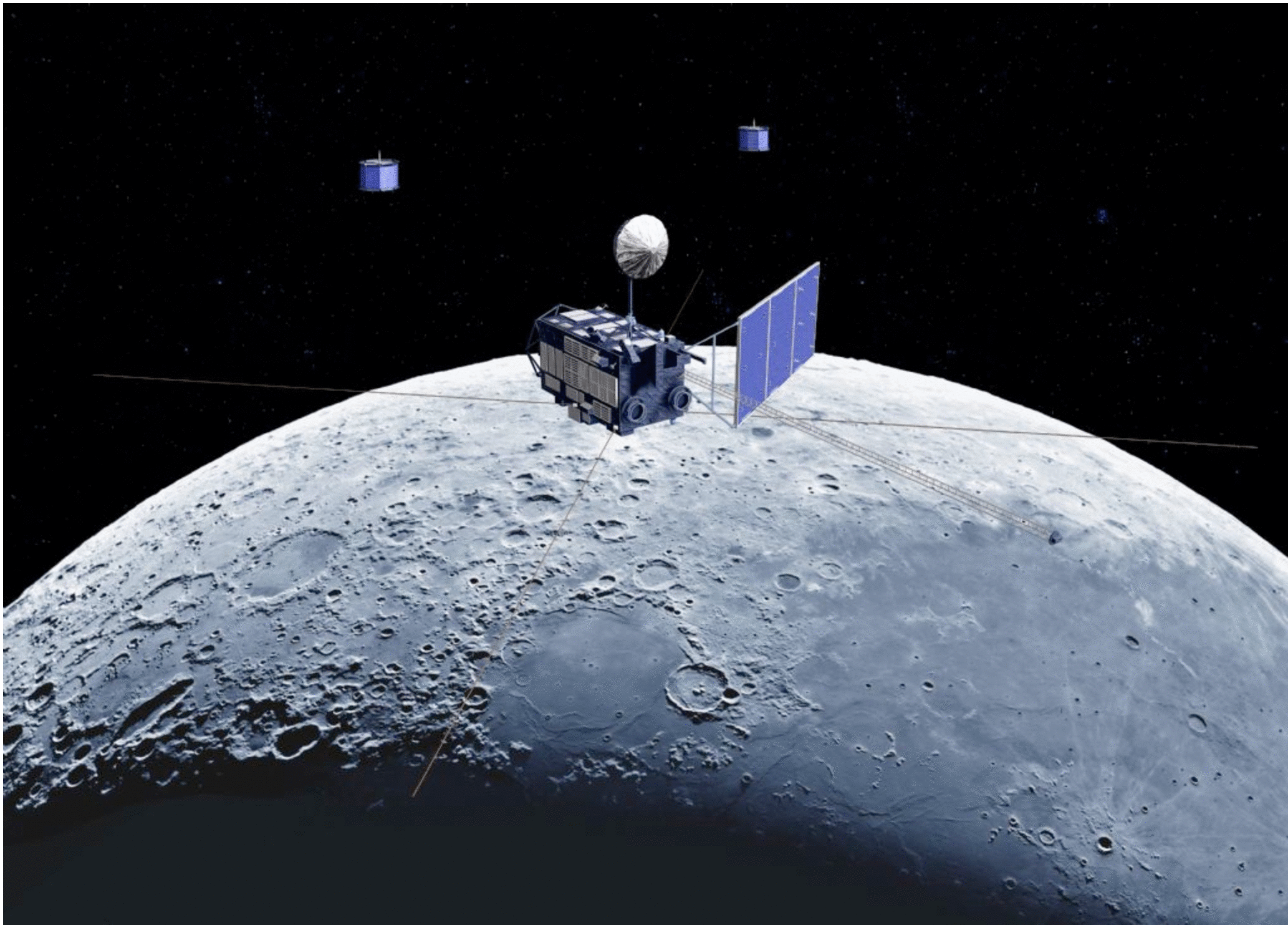 図1. SELENEのイメージ図. SELENEは主衛星と2機の子衛星 (リレー衛星およびVRAD衛星) で構成された.