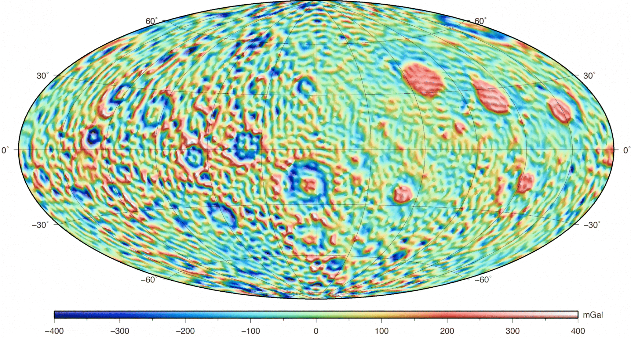 図5. SELENEブーゲー重力異常マップ. 図の右側が月の表に, 左側が裏に相当する.