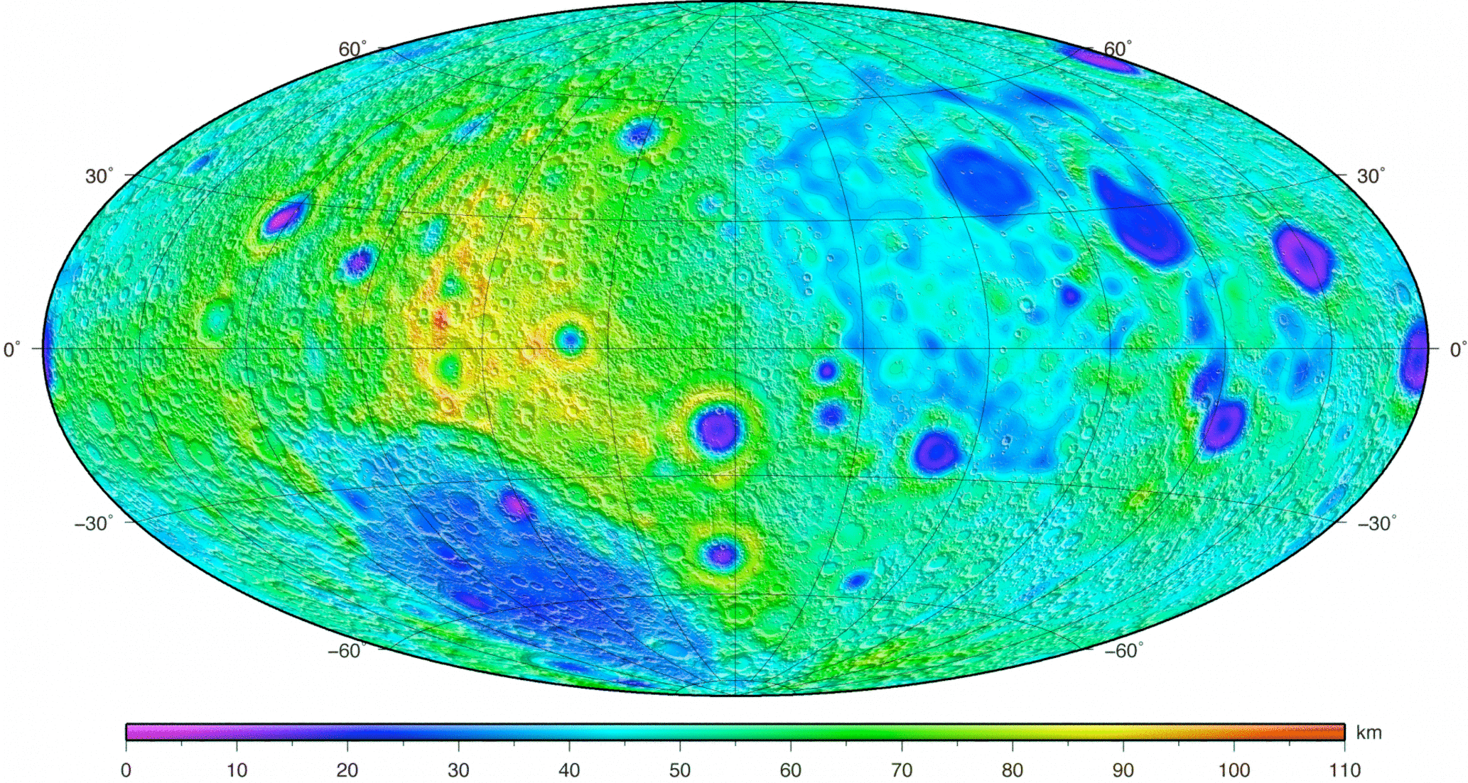 図6. SELENEデータによる地殻厚さモデル. 図の右側が月の表に, 左側が裏に相当する.