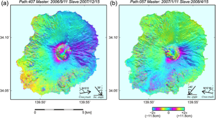 三宅島は東京の約180km南に位置しており, 最近の500年間では17~69年の間隔でマグマ噴火が発生している活動的な火山である. 2000年の噴火においては山頂部が陥没し, 直径が約1.6kmのカルデラを形成した. 2001年初頭に実施された国土地理院によるレーザースキャナー測量によれば, その容積は約6億m$^{3}$と推定された. その後, 火山活動は時間とともに静穏化し, 2003年9月に再測されたカルデラの容積は2001年における結果と有意な差はなかった(長谷川ほか, 2004). しかし, より細かな地殻変動が生じている可能性が考えられるため, PALSARを用いたSAR干渉法により, 三宅島の地殻変動を調査した. PALSARは34.3度のオフナディア角を基本観測モードとして定期的な観測を実施していたが, オフナディア角が41.5度の観測モードによる観測も実施されており, 三宅島については, 6つの軌道から観測されたPALSARデータにSAR干渉法の適用が可能であった. その結果, 火口周辺域において, 衛星‐地表間距離(スラントレンジ)が伸長したことを示す変化が見られた(図3). この変化は, 使用したデータペアの取得間隔が長いほど大きくなる傾向が見られることから, 継続的に進行していたものと考えられる.