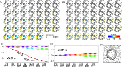 図5 InSAR時系列解析によって推定された地殻変動時系列. (a), (b) 準上下成分と東西成分. すべての図は2006年6月12日からの変化量を示す. 時間ステップは46日毎. (c), (d) (e)に示す地点の地殻変動時系列.
