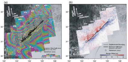 図1. 2008年中国四川省地震に伴う地殻変動. (a)干渉SAR解析結果, (b)ピクセルオフセット解析の結果(レンジ成分). 小林他(2011)
