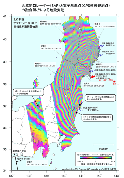 2011年3月11日, 東北地方の太平洋沖を震源とするMw 9.0の巨大地震が発生した. ALOS/PALSARはただちに大規模な緊急観測を行い, 東日本全域の上昇軌道と一部の下降軌道を撮像した. その後, 4月22日に電源トラブルに見舞われ, 5月に運用を停止する. この間に得られたSAR画像から, 世界で初めてマグニチュード9の超巨大地震が引き起こした地殻変動を面的に得ることができた.