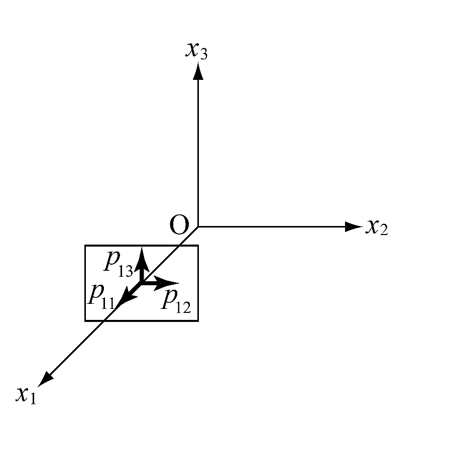 物体内部に$x_1, x_2, x_3$をとる. $x_1$軸に垂直な微小面を考え, 面を通して働く力を単位面積あたり$p_{11}, p_{12}, p_{13}$とする(図1). このとき, 面に垂直な$p_{11}$ を法線応力, 面に平行な$p_{12}$ と$p_{13}$ を接線応力と呼ぶ. 応力の単位は圧力と同じPaであるが, barが用いられることもある.