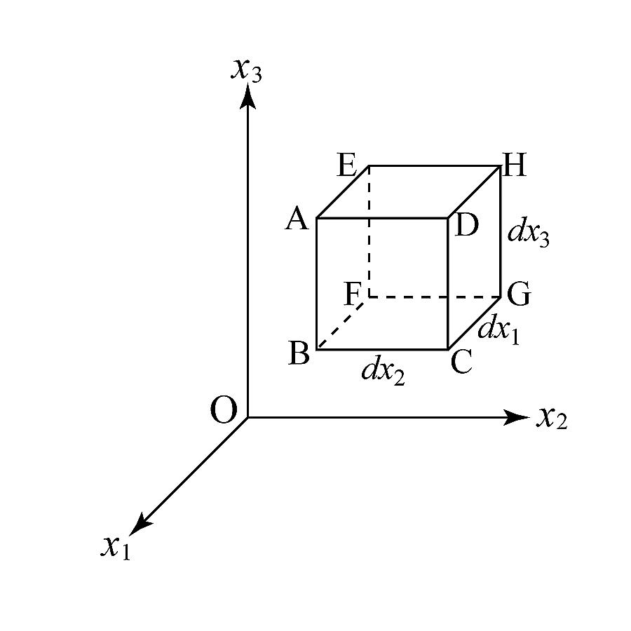 物体中に各辺の長さが$dx_{i}$の微小体積を考える(図2). 力は応力と面積の積で与えられるので, 面EFGHを通して働く$x_1$方向の力は