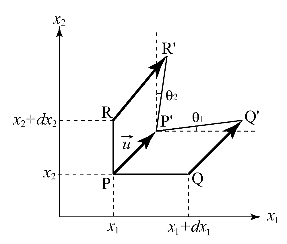 変形前に直角を形成していた3点P, Q, Rが変形後にそれぞれP’, Q’, R’に変位したとする. $ {\mathbf P}{\mathbf P’}={\mathbf u} (u1 , u2 )$ とすると